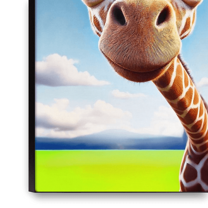 Das digitale Kunstwerk zeigt eine humorvolle Szene, die sofort ein Lächeln auf die Lippen zaubert. Im Fokus steht eine Giraffe, deren Hals sich elegant, aber leicht schief in den Vordergrund des Bildes erstreckt. Ihr Gesicht dominiert die Komposition: Große, runde Augen, die charmant schielend wirken, scheinen den Betrachter direkt…
