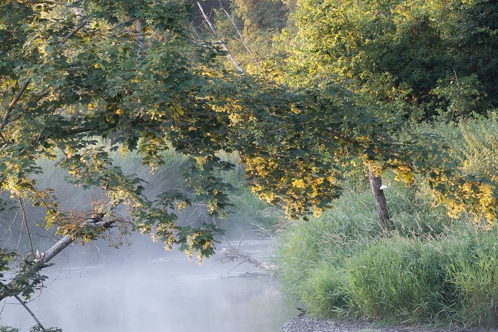 Szene entlang der Geul in Südlimburg am Morgen. Der Nebel über dem Wasser verleiht der Szene eine mystische Atmosphäre.