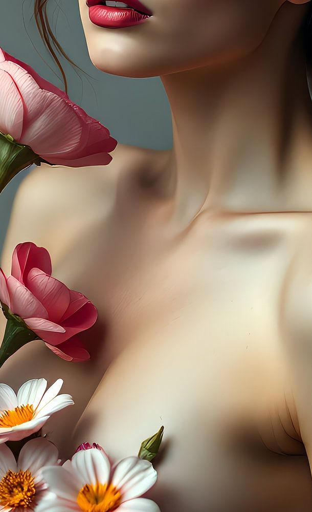 malerisches fotorealistisches Bild einer nackten fiktiven Frau mit Blumen