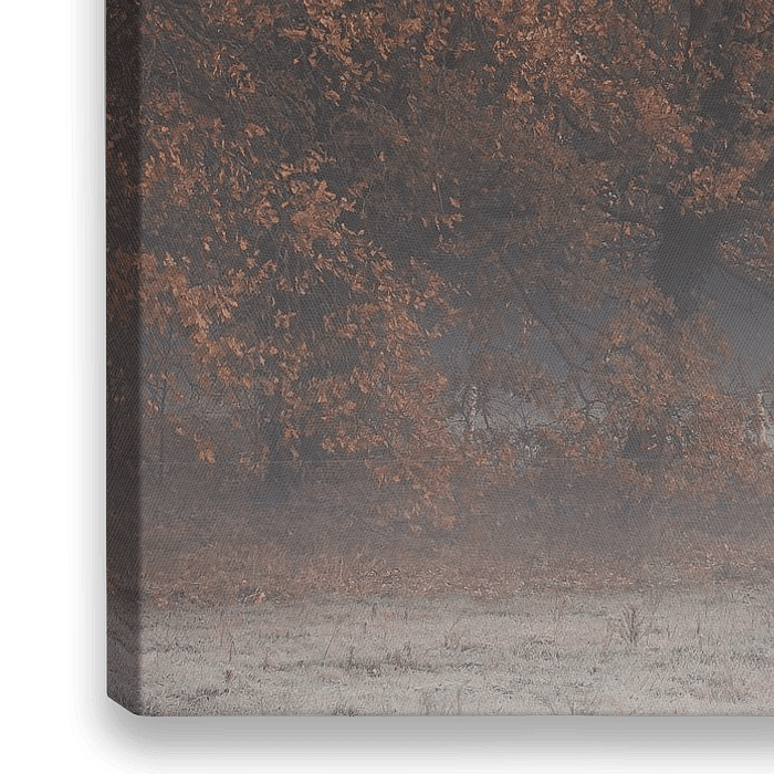 Landschaft mit einem schönen braun gefärbten Baum, dessen Stamm in Morgennebel gehüllt ist