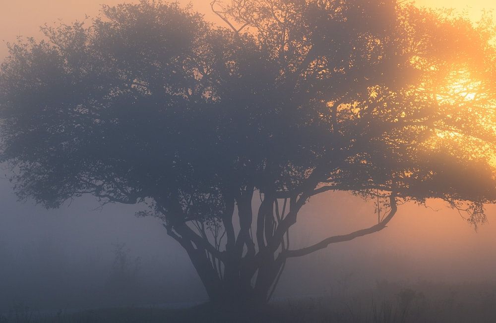 Ein einsamer Baum steht in einer nebligen Landschaft mit der auf- oder untergehenden Sonne im Hintergrund, die ein warmes Licht durch seine Äste wirft. Der Nebel verleiht der Szene eine ruhige und geheimnisvolle Atmosphäre.
