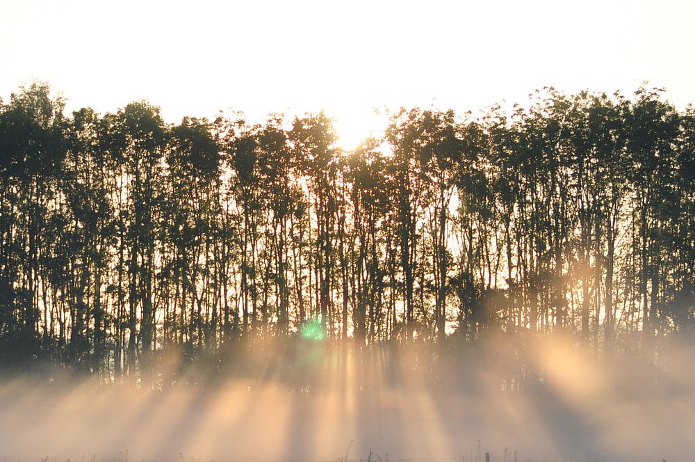 ochtendmist met de zon door de bomen te ter idzard