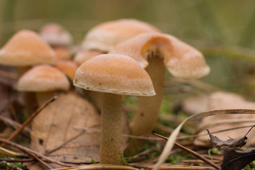 Een kleine paddenstoel op een boomstam, woont daar met zijn familie.