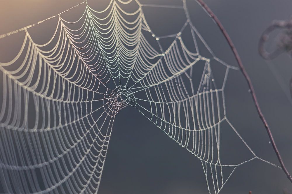 Nahaufnahme eines schönen Spinnennetzes, komplett mit Tautropfen bedeckt, und einem weichen Pastell Hintergrund