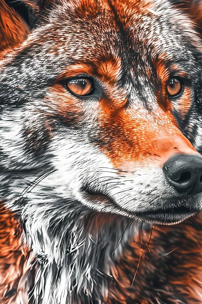 Diese atemberaubende Nahaufnahme eines roten Wolfs ist ein Meisterwerk der modernen Naturfotografie. Der intensive Blick des Wolfs, der in scharfen Details eingefangen wurde, zieht Sie direkt in den Bann. Die satten, warmen Farbtöne des Fells kontrastieren wunderbar mit dem kühlen, unscharfen Hintergrund und schaffen ein Gefühl von Tiefe und Geheimnis. Dieses Kunstwerk ist perfekt für jeden, der die wilde Schönheit der Natur zu schätzen weiß.