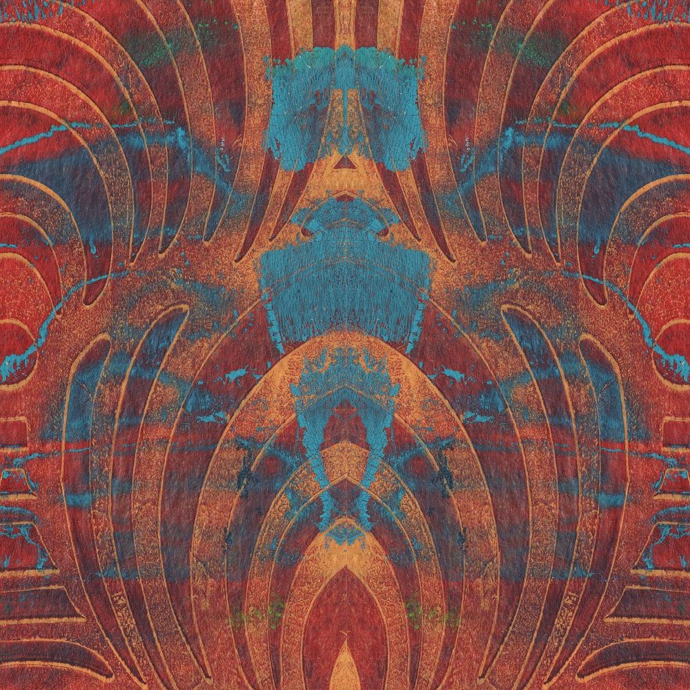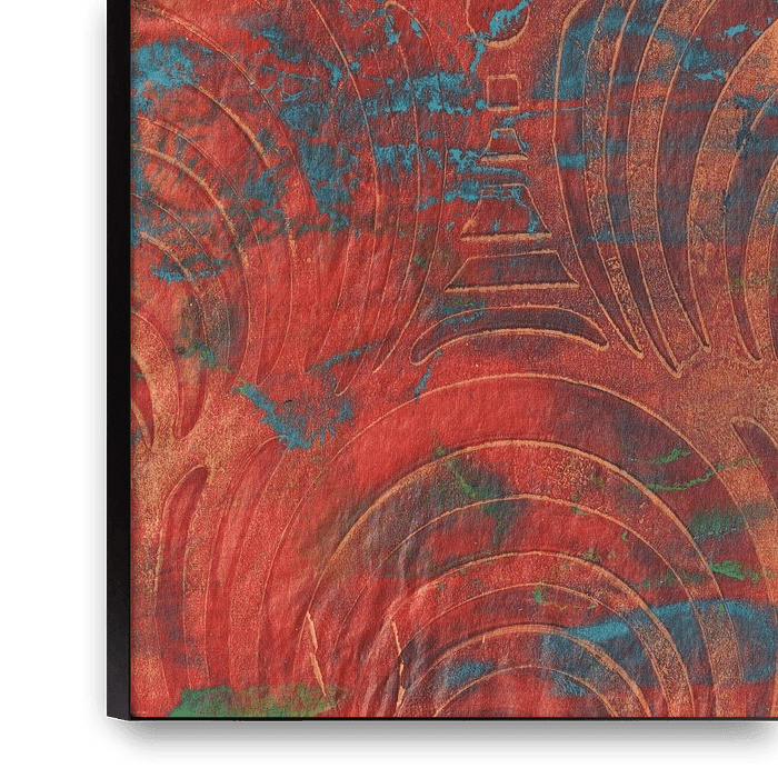 Quadratischer Druck in Rottönen mit Akzenten in Türkis, Goldgelb und Grün.