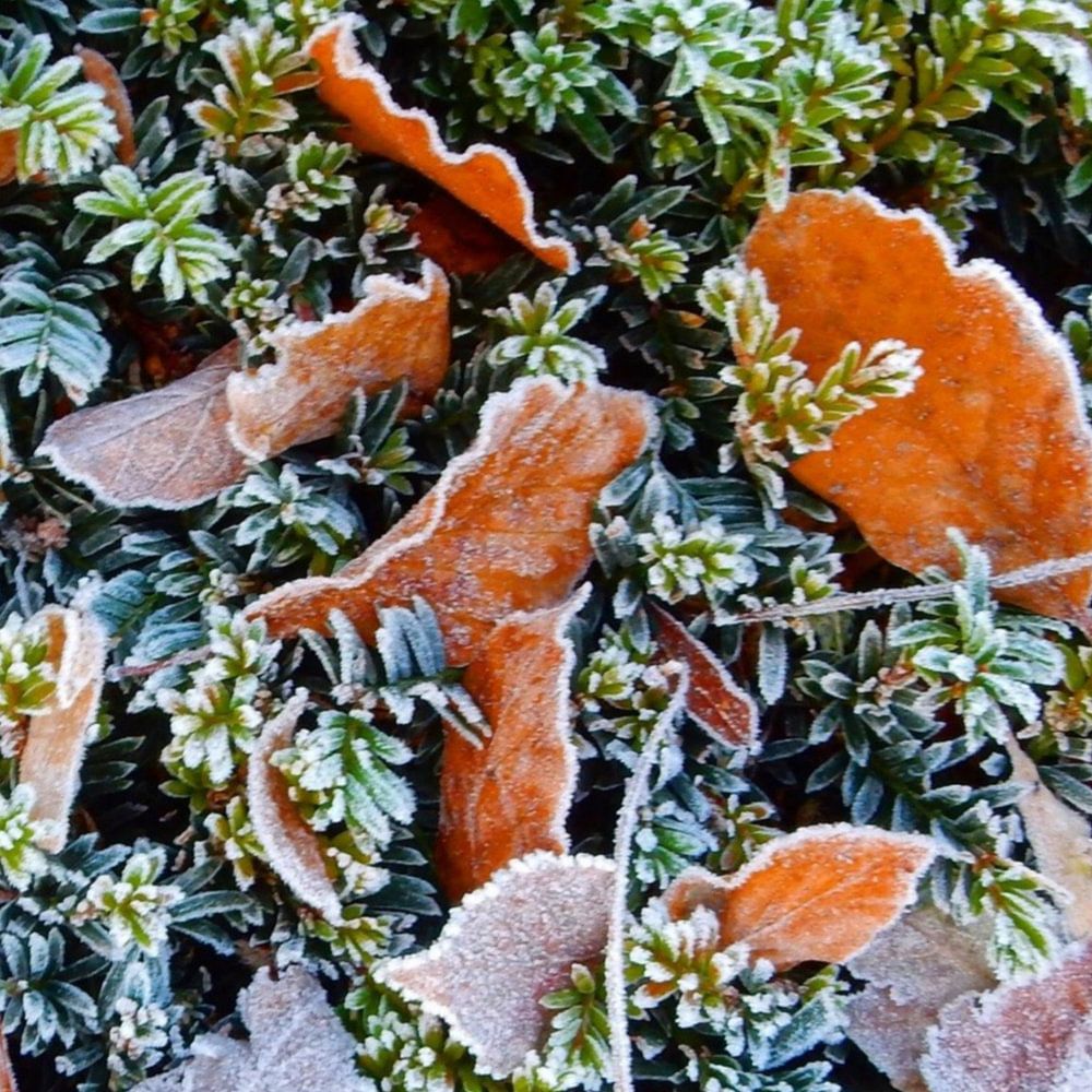 Frostrunde auf Herbstblättern und Grünpflanzen