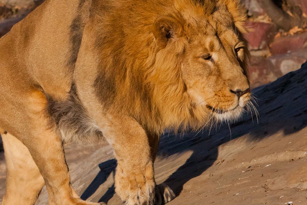 Über „schleichend den Hügel hinauf. Ein kräftiges Löwenmännchen mit einer schicken, vom Abendlicht erleuch“ von Michael Semenov