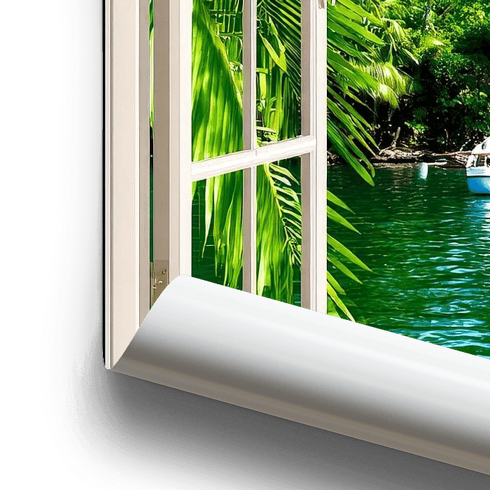 fotorealistisches digitales Bild des Blicks vom Haus auf eine schöne Landschaft oder einen Garten mit feinen Details und leuchtenden Farben