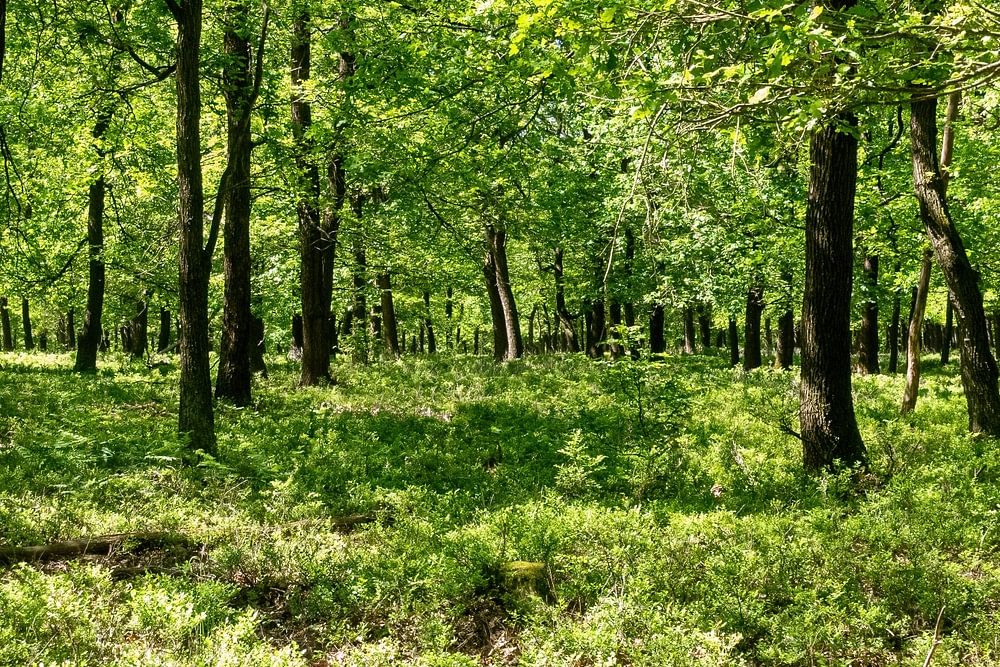 Das Grün der Bäume im Wald mit dem Licht der durchscheinenden Sonne bietet ein wunderschönes Schauspiel.