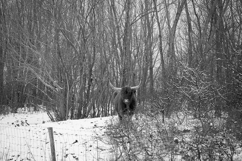 zwart wit foto van een schotse hooglander in het bos