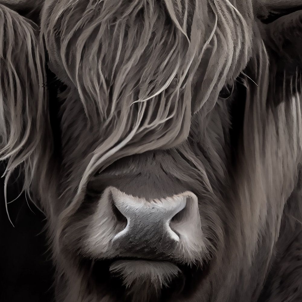 Bild eines schottischen Hochländers in Grau, Schwarz und Sepiatönen. Eindringlich, frech und einnehmend. Schöner Kontrast auf schwarzem Hintergrund. Passt zu verschiedenen Stilen und Trends.