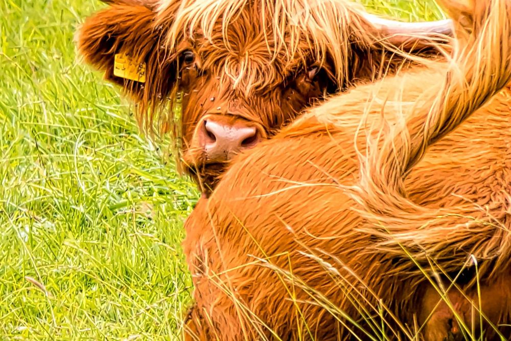 schottisches Hochlandrind mit wedelndem Schwanz liegt auf Weide