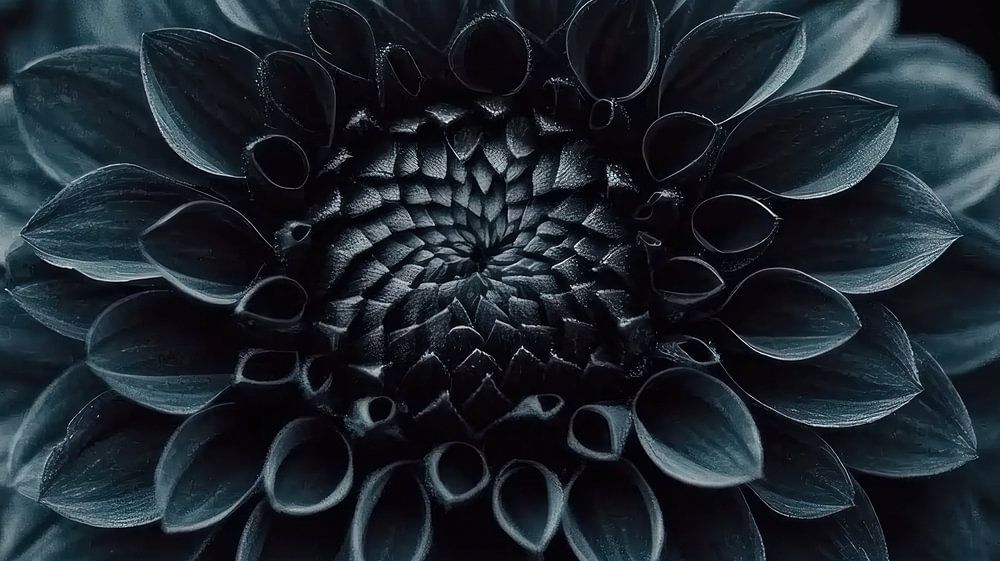 Die Dahlie füllt den gesamten Rahmen aus, ihre samtig schwarzen Blütenblätter winden sich spiralförmig zur Mitte hin. Die intensive schwarze Farbe der Blüte ist nicht einheitlich, sondern offenbart je nach Lichteinfall auf die Blütenblätter subtile Nuancen von tiefem Violett, Mitternachtsblau und sogar Andeutungen von Dunkelgrün. Diese Schattierungen verleihen dem ansonsten monochromen Bild Tiefe und Dimension.