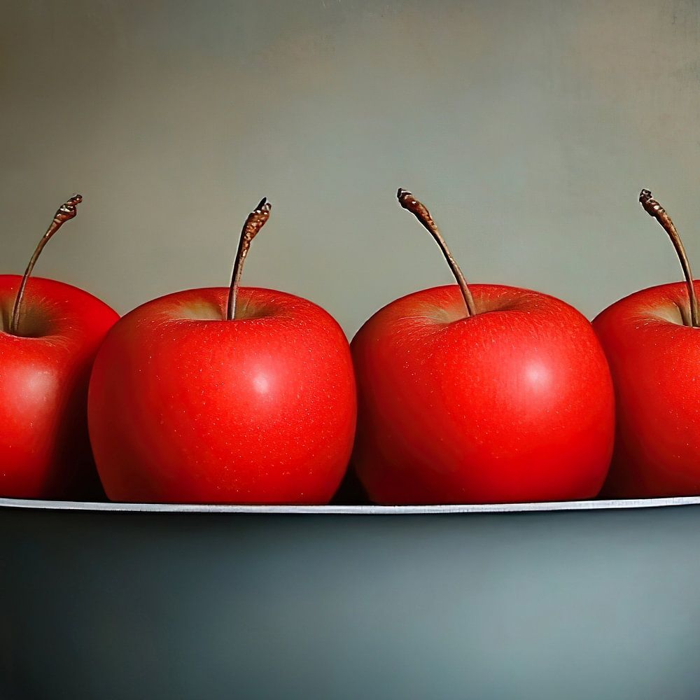 Eine hyperrealistische Obstschale voller lebendiger, reifer Äpfel in intensivem, leuchtendem Rot, das von der Leinwand spritzt. Dieses moderne Stillleben zeigt ein harmonisches Zusammenspiel von leuchtend roten Äpfeln, bei dem jedes Stück Obst in einem hyperrealistischen Glanz erstrahlt. Das Licht fällt perfekt auf die Früchte und macht die Details ihrer Textur und Saftigkeit fast greifbar.