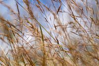 Blühende Gräser werden an einem Sommertag von einer unerwarteten Windfahne hin und her geweht. Das Foto wurde in einem Naturschutzgebiet entlang der Gilzewouwerbeek in der Nähe des Dorfes Bavel.... aufgenommen.