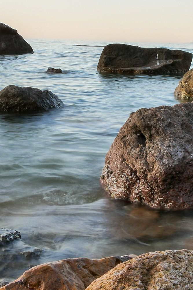 rotsblokken in de zee met lange belichtingstijd hierdoor onstaat er een zachte zee en lucht.