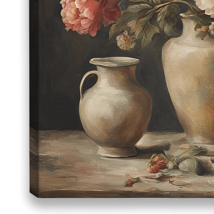 Entdecken Sie die Schönheit eines traditionellen Stilllebens, das für die moderne Zeit neu interpretiert wurde. Dieser Digitaldruck ist eine Ode an die alten Meister und fängt die subtilen Nuancen von Licht und Schatten ein. Perfekt für Kunstliebhaber, die eine zeitlose Ergänzung für ihr Interieur suchen.