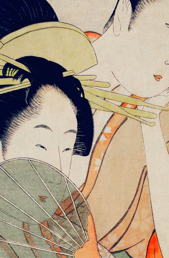 Chojiya Hinazuru Hinamatsu von Utamaro Kitagawa (1753-1806), ein Druck einer traditionellen japanischen Kurtisane, die einen Fächer mit aufwändigem Haarschmuck hält.