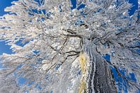 Eine alte Buche im Erzgebirge hat sich mit Eis und Schnee geschmückt. Die Sonne strahlt vom blauen Winterhimmel.