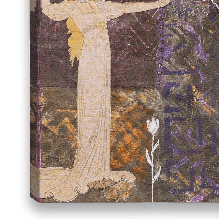 quadratische Collage in dunkelbraunen und violetten Tönen links eine hellgelbe weibliche Figur…