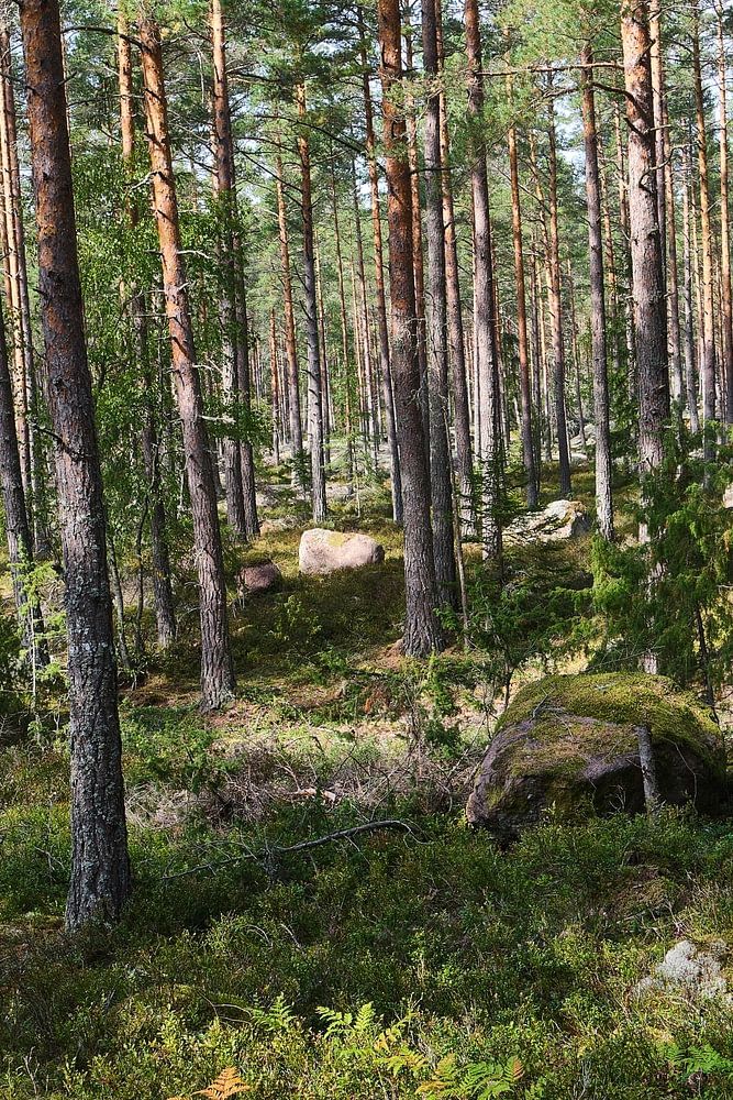 Bäume in Schweden mit im Vordergrund e Heidelbeere Vegetation auch einige Felsen ist es eine typische smalland Wald Blick