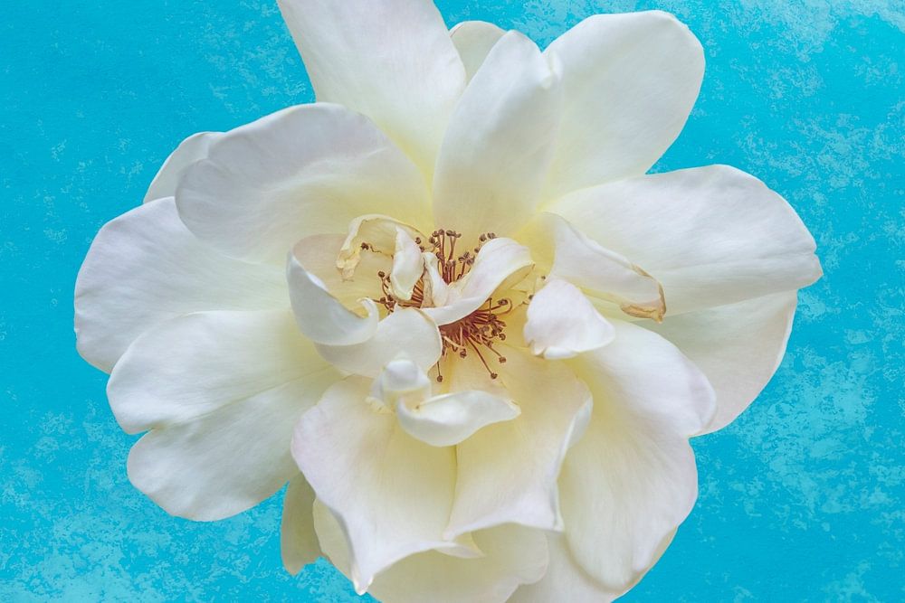 Ein Makrofoto einer weißen Rose auf blauem Hintergrund, dem ich etwas Phantasie hinzugefügt habe.