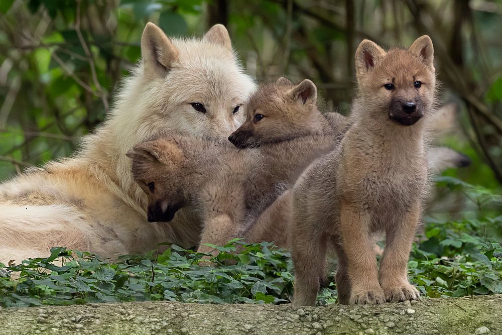 Hudson-Bay-Wolf mit Welpen. Der Hudson-Bay-Wolf (canis lupus hudsonicus) ist ein weißer Wolf und eine Unterart des grauen Wolfes. Kommt hauptsächlich in Kanada vor. Er ähnelt dem arktischen Wolf ( canis lupus Arctos), hat aber einen flacheren Schädel.
