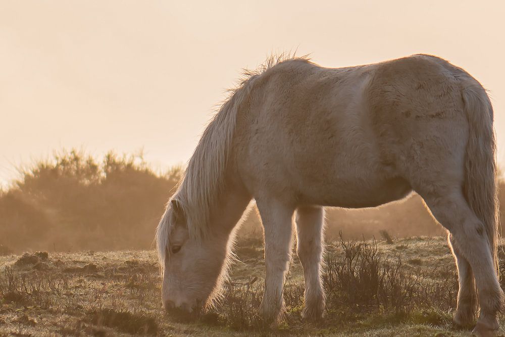 ein weißes Wildpferd, das auf den Mooren der Posbank grast, im goldenen Licht des Sonnenaufgangs, an einem kalten Herbsttag.