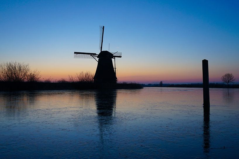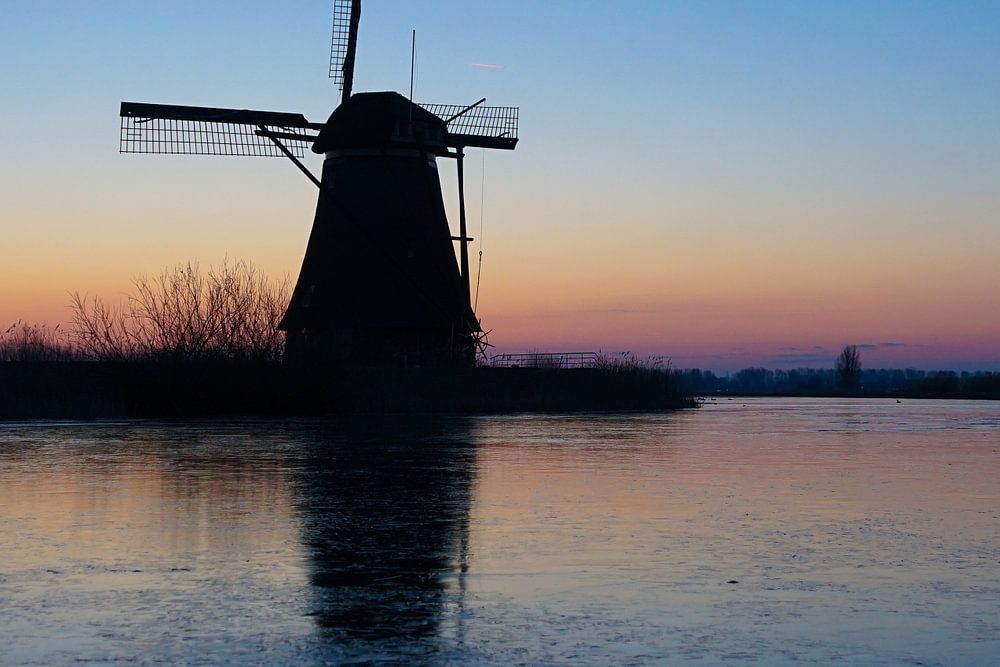 op het water ligrt een laag ijs, het is winter. de molen reflecteerd prachtig op dit ijs.