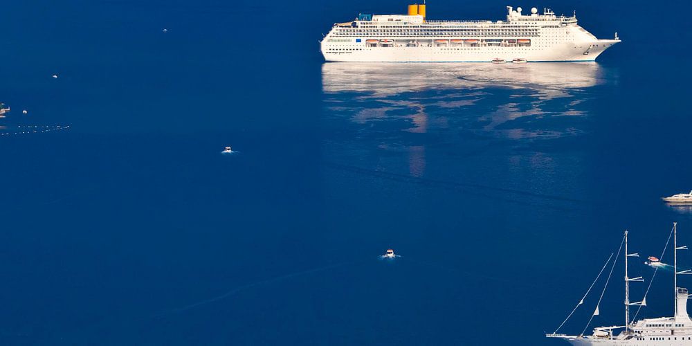 zwei Schiffe im strahlend blauen Meer und ein kleines Mädchen mit roten Dächern. Ein schönes Kreuzfahrtschiff in der blauen Meeresbucht weit unten. Die Bucht von Montenegro Kotor.