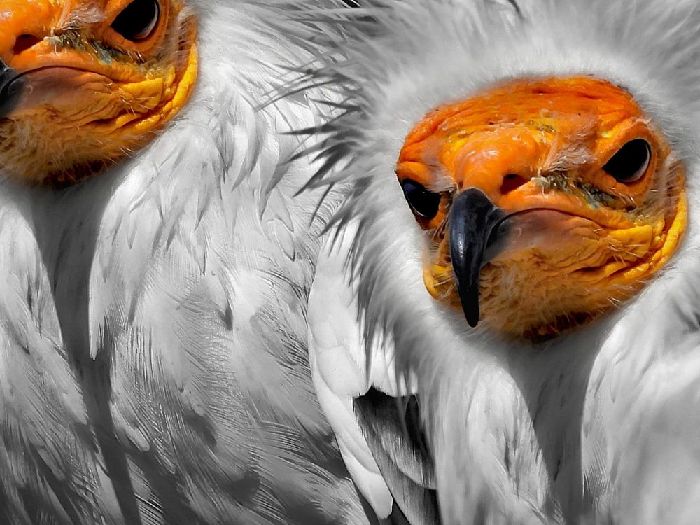 Dieses Paar wurde sorgfältig vor einem schwarzen Hintergrund platziert, um diese Vögel mit ihren auffälligen orangefarbenen Gesichtern schön zur Geltung zu bringen.