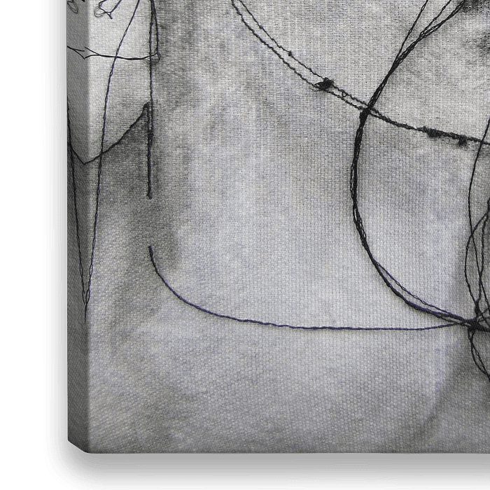 Ein figuratives schwarz-weißes Werk aus Nadel und Faden, ein kraftvolles und verletzliches Gesicht.