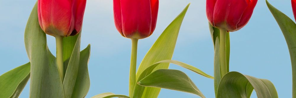 eine Reihe von roten Tulpen leuchtet in der Sonne schöne rote Tulpen mit frischen grünen Blättern