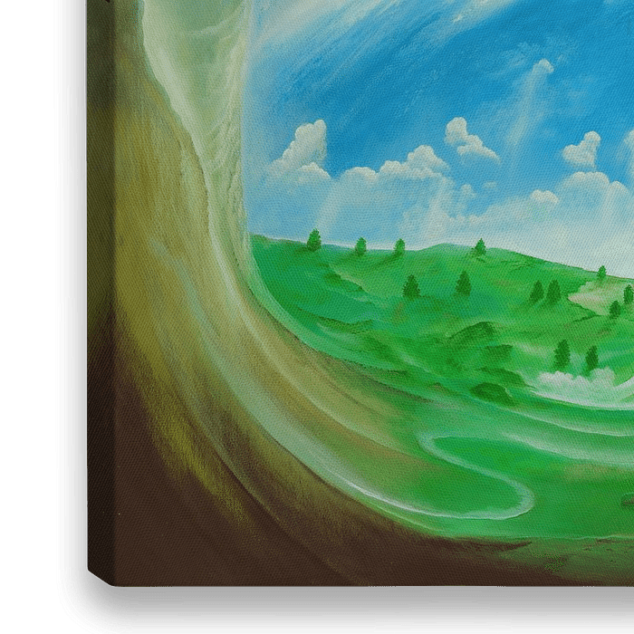 Das surreale Ölgemälde gewährt uns einen faszinierenden Blick auf die Erde aus einer überirdischen Perspektive, als ob wir im Weltraum auf einem erhabenen Plateau säßen und von dort aus auf unsere Heimat, die Erde, hinabblicken würden. Die Szene erweckt einen gleichzeitig surrealen und beeindruckenden Eindruck.