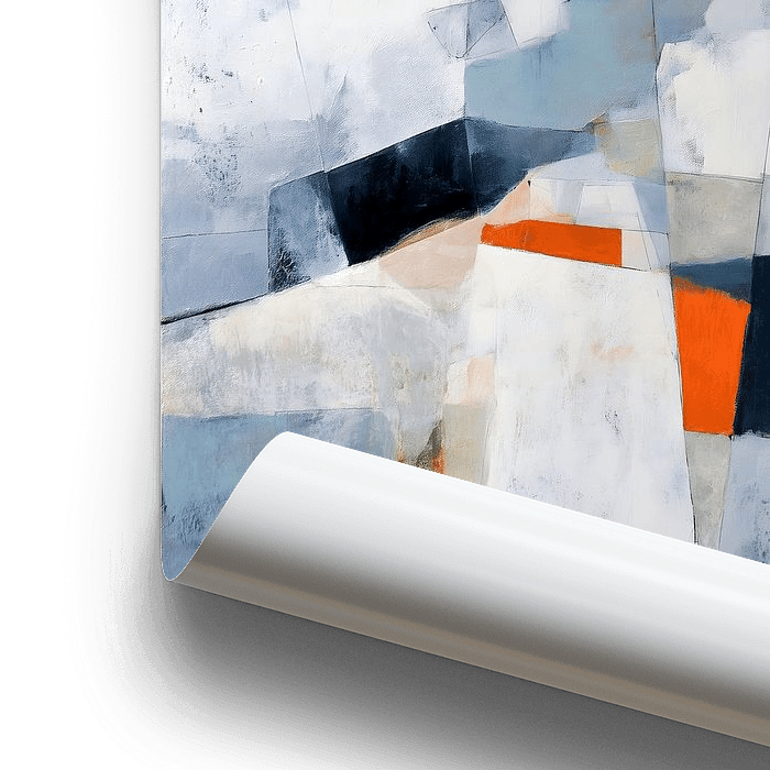 Sanftes Weiß und kühles Blau bilden eine beruhigende Basis, während kräftige Akzente in Ocker und Tiefblau für Wärme und visuelle Faszination sorgen. Subtile Linien und mehrschichtige Texturen laden zu einer näheren Betrachtung ein und bieten Tiefe und Raffinesse, die eine wiederholte Betrachtung lohnen.