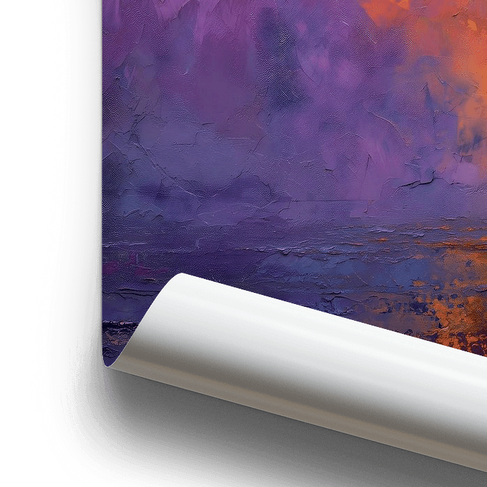 Tauchen Sie ein in die vibrierende Energie dieser abstrakten Sonnenuntergangslandschaft, in der leuchtende Farben und ausdrucksstarke Texturen zu einem wahrhaft hypnotisierenden Kunstwerk verschmelzen. Das mit einer meisterhaften Palettentechnik geschaffene Kunstwerk zeigt dynamische Schichten aus Violett, Orange und Blau und erinnert an die flüchtige Schönheit der Dämmerung, die sich in ruhigen Gewässern spiegelt.