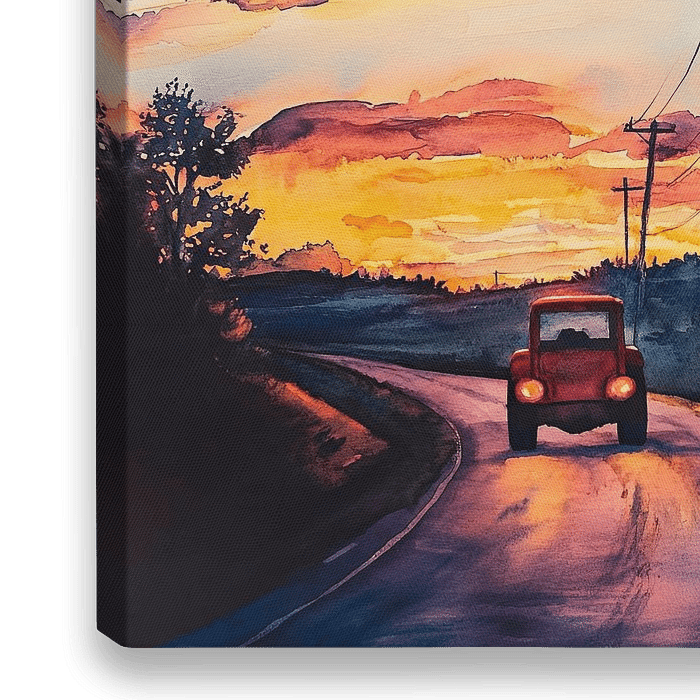 Bestelle dieses Landschafts-Wandbild Abendfahrt im farbenfrohen Licht von Poster Art Shop als Reproduktion auf Leinwand, Alu-Dibond, als Poster, Fototapete oder Acrylglasbild.