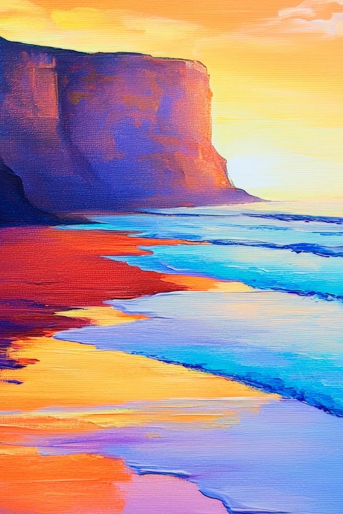 Ein zauberhaftes Farbenspiel verwandelt die Küstenlandschaft in ein traumhaftes Gemälde. Sanfte Wellen küsst der strahlende Horizont, während lebendige Violett- und Orangetöne die Abenddämmerung einfangen. Dieses Kunstwerk eignet sich perfekt für das Wohnzimmer, wo es ein Gefühl von Ruhe und Inspiration vermittelt. Ein wahrhaft…