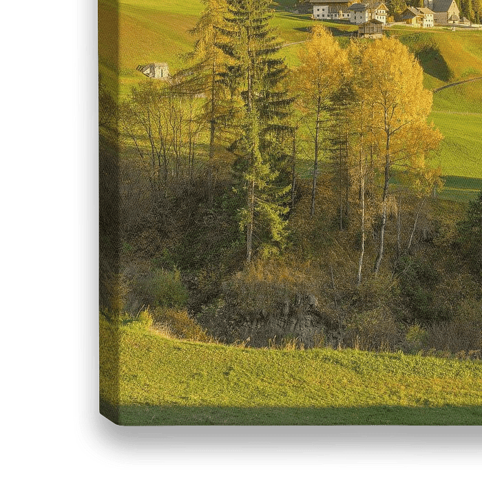 Die späte Nachmittagssonne taucht die malerische Landschaft im Villnösstal in ein warmes Licht. Im Hintergrund sind die Geislerspitzen zu sehen, die zu den bekanntesten Bergen der Dolomiten zählen.