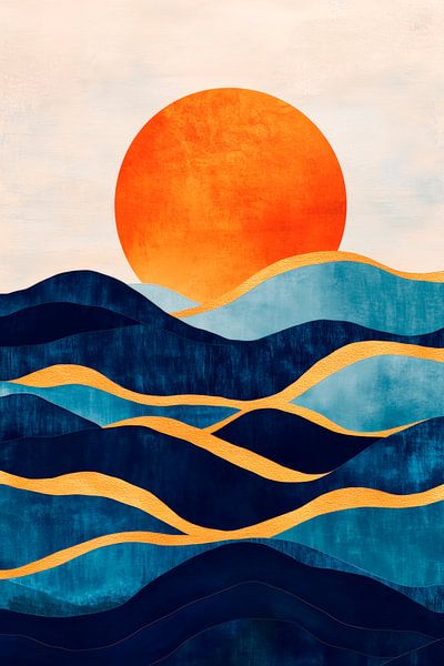 Bestelle dieses Landschafts-Wandbild Abendsonne über stilisierten Wellen von Poster Art Shop als Reproduktion auf Leinwand, Alu-Dibond, als Poster, Fototapete oder Acrylglasbild.