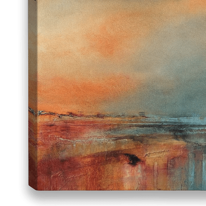 Ein glutroter Himmel, die Wolken spiegeln sich in der abstrahiert gemalten Landschaft. Küste, Wasser. Ein Hauch von Türkis. Der Blick wandert zum Horizont, die Landschaft ist weit.