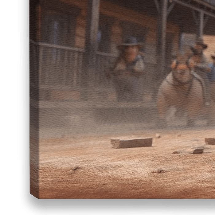Mitten auf der Hauptstraße einer pulsierenden Westernstadt, direkt vor dem staubigen Horizont, stehen zwei charakterstarke Mäuse. Die eine, gekleidet in Sheriff-Montur, strahlt Entschlossenheit und Mut aus, während die andere, in traditioneller indianischer Tracht, Neugier und Weisheit verkörpert. Hinter ihnen lebt die Stadt mit…