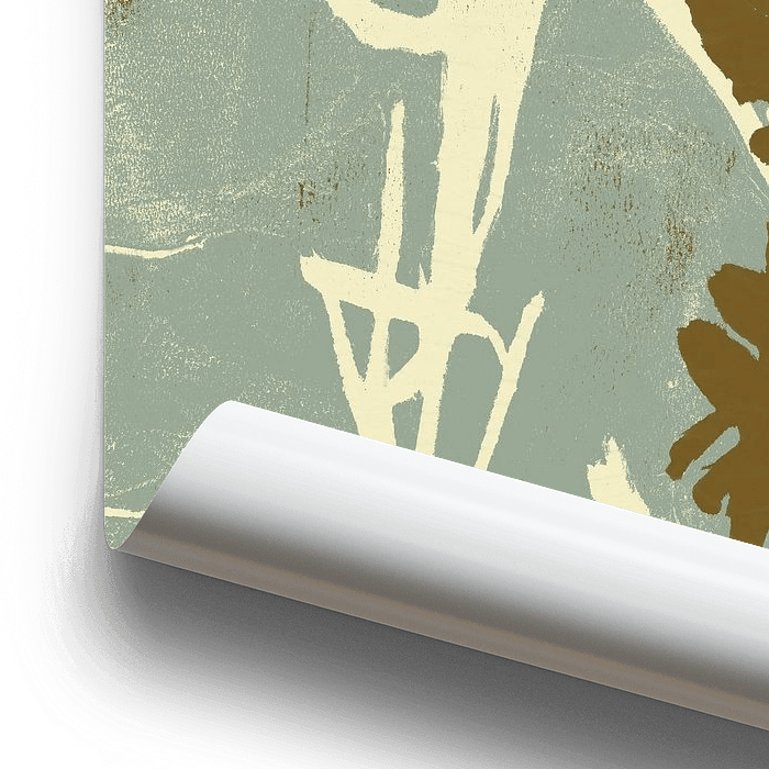 Bestelle dieses abstrakte Wandbild Abstrakte Botanik. Blumen in Weiß und Gold auf Salbei. von Dina Dankers als Reproduktion auf Leinwand, Alu-Dibond, als Poster, Fototapete oder Acrylglasbild.