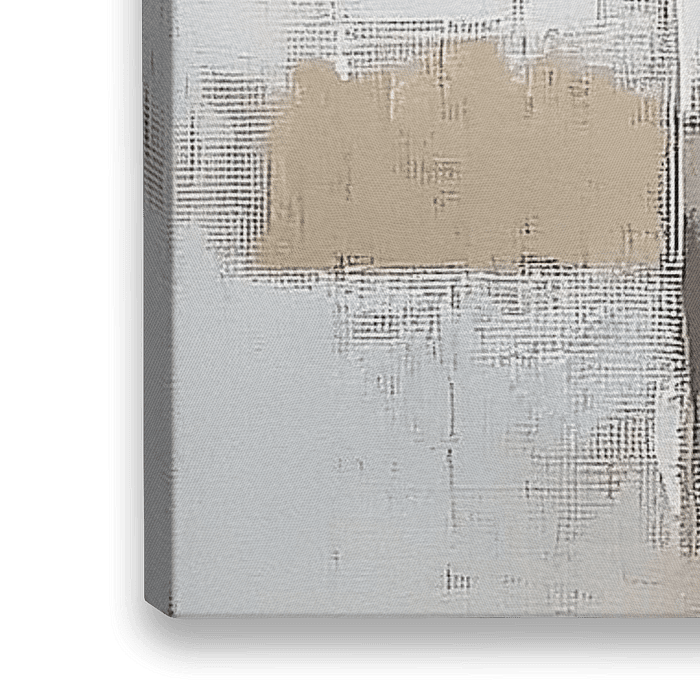 Abstrakte Erdtöne - Dieses abstrakte Gemälde zeichnet sich durch sich überschneidende rechteckige Formen und eine subtile Farbpalette aus Beige, Braun und Weiß aus, deren horizontale und vertikale Linien ein Gefühl von Struktur und Gleichgewicht erzeugen.
