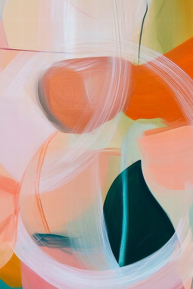 Sanfte Pastellfarben und fließende Formen vereinen sich in dieser lebendigen Komposition, die eine harmonische Balance zwischen Energie und Eleganz ausstrahlt. Die warmen Töne von Aprikose und sanften Grüntönen erzeugen eine einladende Atmosphäre, die perfekt für ein Wohnzimmer geeignet ist, um Gemütlichkeit und Kreativität zu fördern.