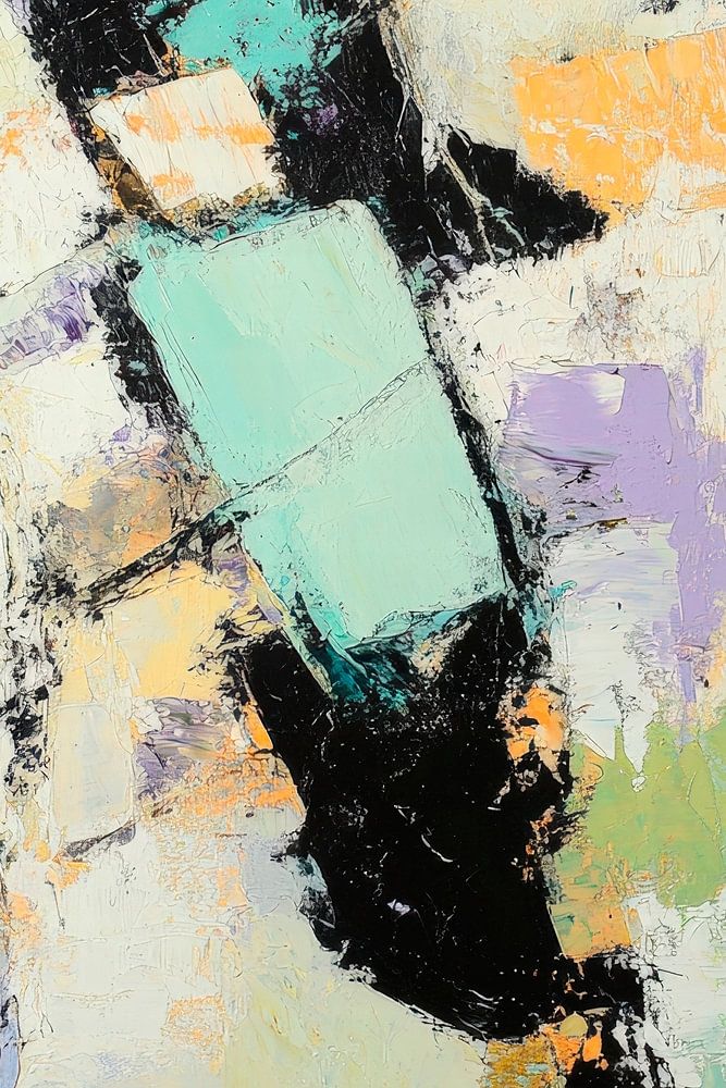 Mit dynamischen Formen und leuchtenden Farben entfaltet sich eine spannende Komposition, die den Raum belebt. Die Kontraste zwischen sanften Pastelltönen und kräftigem Schwarz verleihen dem Bild eine moderne Eleganz. Ideal für das Wohnzimmer, sorgt es für anregende Gespräche und inspiriert zur Kreativität.