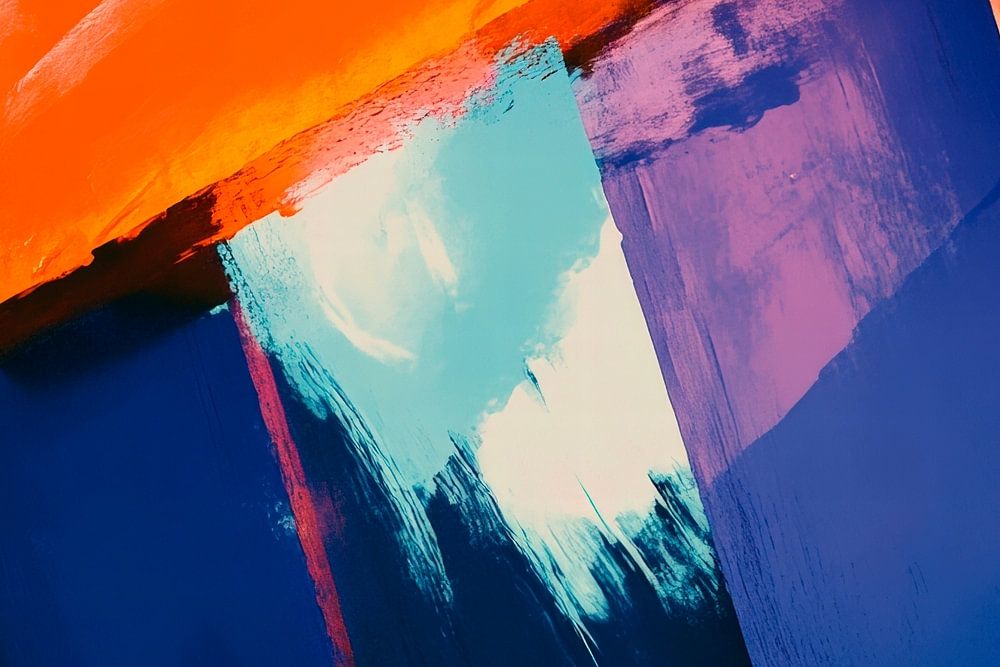 Leuchtende Farbakzente in feurigen Orangetönen kontrastieren mit tiefen Blau- und Violettnuancen, die Energie und Dynamik ausstrahlen. Diese abstrakte Komposition zieht sofort die Blicke an und schafft eine inspirierende Atmosphäre. Ideal für ein kreatives Büro oder ein modernes Wohnzimmer, wo Leidenschaft und Kreativität blühen können.