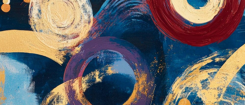 Ein faszinierendes Farbspiel aus lebhaften Rottönen und sanften Goldnuancen, umrahmt von tiefblauen und weißen Hintergründen. Die dynamischen Kreise und geschwungenen Linien verleihen dem Raum Energie und Kreativität. Perfekt für ein Büro, inspiriert es zu neuen Ideen und belebt die Arbeitsatmosphäre mit einem Hauch von Modernität.