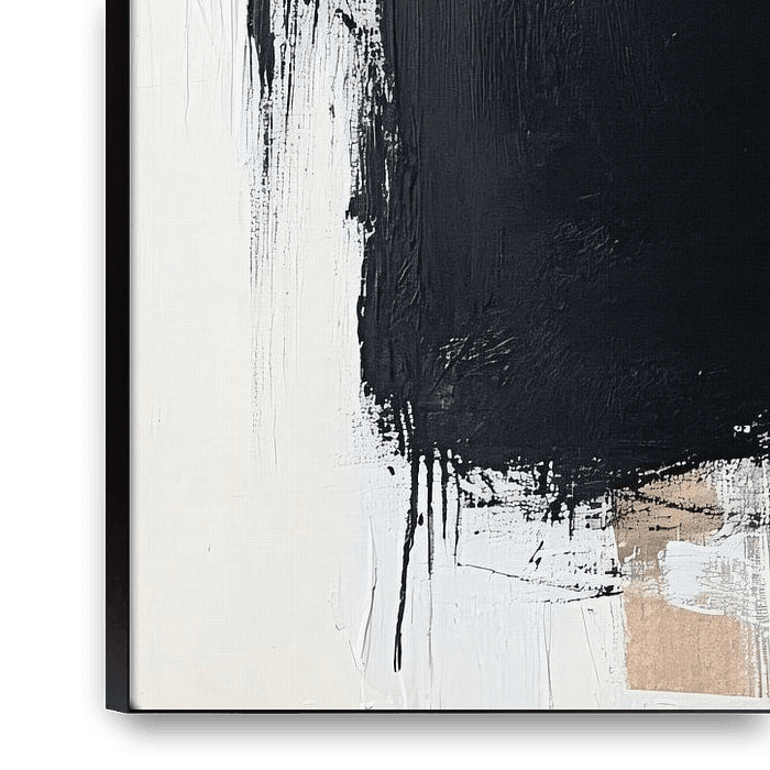 Dieses abstrakte Gemälde mit einer starken, kontrastreichen Komposition verleiht jedem Raum sofort Stil und Tiefe. Die Verwendung von Schwarz- und Beigetönen, durchsetzt mit zarten Rosa- und Weißtönen, schafft ein fesselndes Gleichgewicht zwischen Dunkelheit und Licht. Dieses Kunstwerk passt gut in moderne Innenräume, egal ob es in…